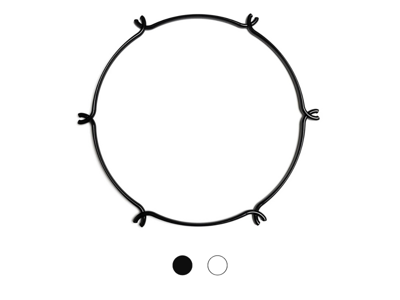 “Cage is assembled from round or square rings, each available in two different sizes, in white or black recycled polymer finish or transparent polycarbonate, which, combined with the cords and desired light bulbs, allow you to create real suspended sculptures.”
