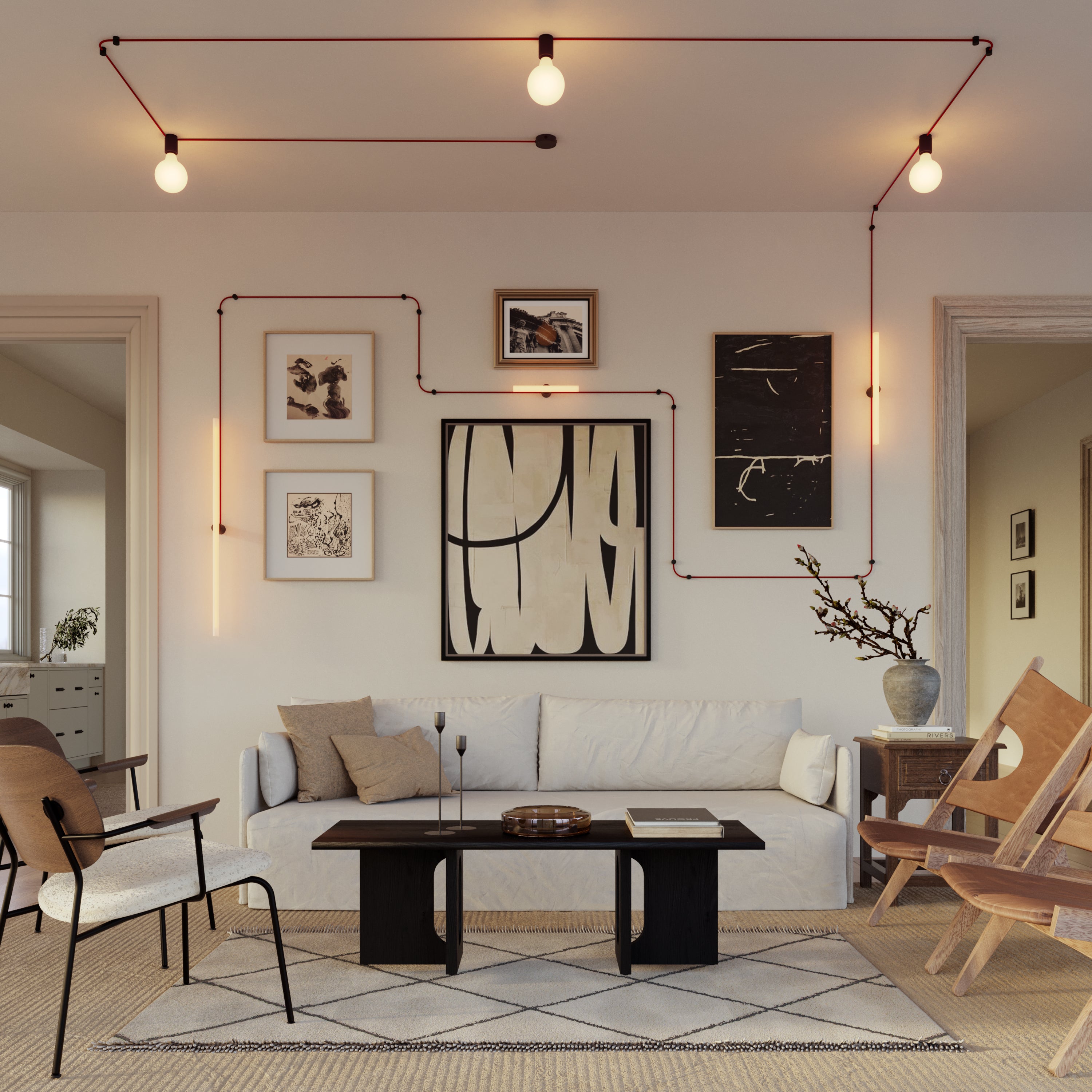 A solution that uses flat, fabric-covered cords, mounted visibly on the wall or ceiling. The light sockets are placed directly along the cord in the desired positions, creating a clean and precise distribution of light.